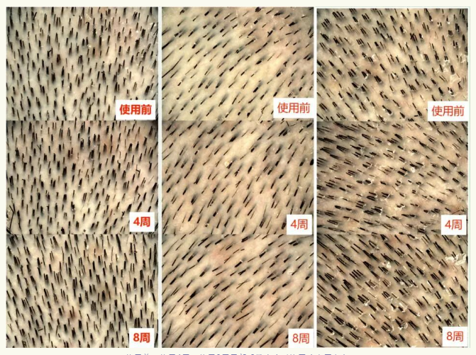 通过与不含有重组XVII型胶原蛋白的基质对照组进行比对,在使用试验产品12周后,整体毛发密度增加显著优于基质对照组,证实了重组XVII型胶原蛋白具有防脱功效。